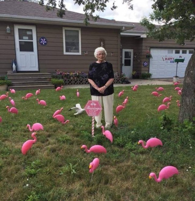 "My grandmother turned 93 today. She's always been a prankster. So all my cousins and I decided to put 93 flamingos in her yard. We're from the Midwest, so it makes sense."