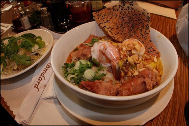 Mì Quảng – Wide rice noodles served with little broth, pork chops, chicken, shrimp, vegetables, peanuts, and rice paper cracker.