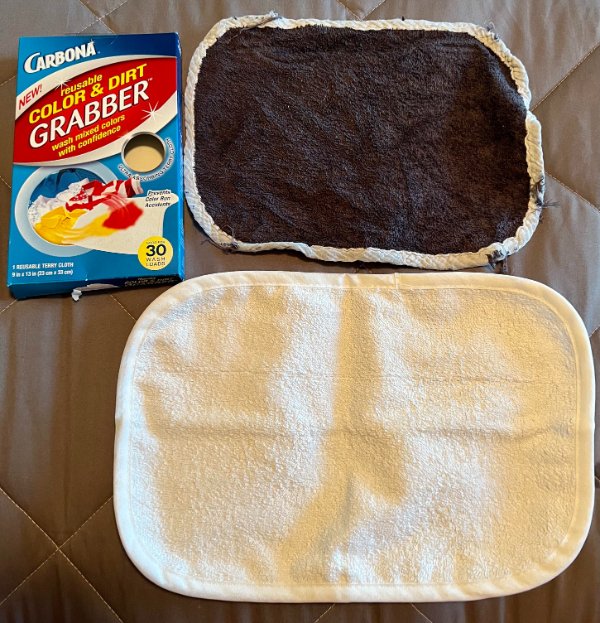 "Brand new laundry dye catcher vs. one used for about a year."